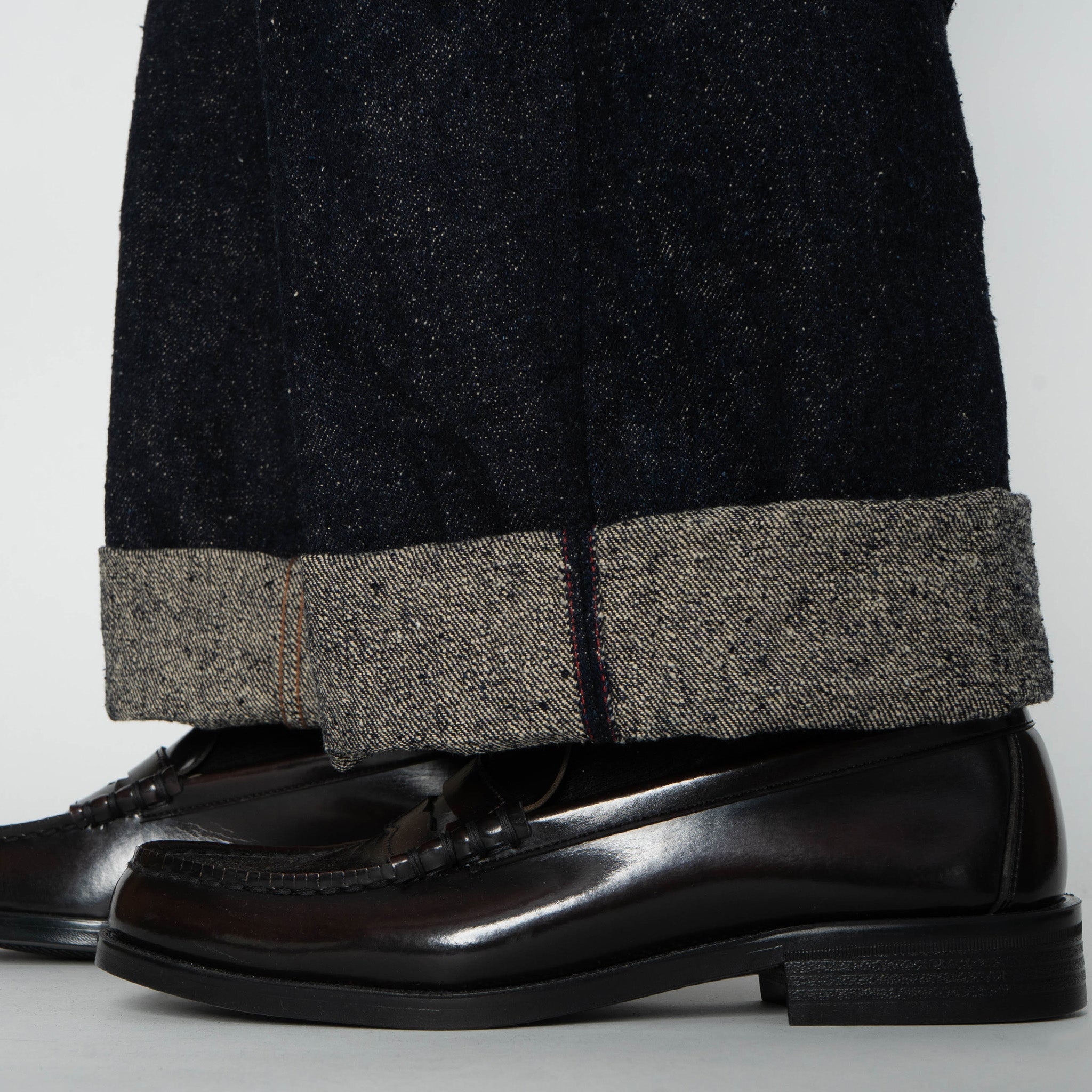 The MIJ16 Genseki Selvedge is a 19oz unsanforized Japanese selvedge denim developed for maximum texture and character. Genseki translates to “raw ore,” a term used to describe unrefined stone in its natural, extracted state. The name reflects the fabric perfectly. Dense, rough, and heavily textured, this denim feels raw and elemental. Woven using slubby and neppy yarns, the fabric displays an intense, irregular surface with visible neps throughout. This yarn character is amplified through low-tension weaving, allowing the fibers to relax and shift on the loom. An earthy-toned weft adds warmth beneath the indigo warp, enhancing contrast and depth as the denim ages.