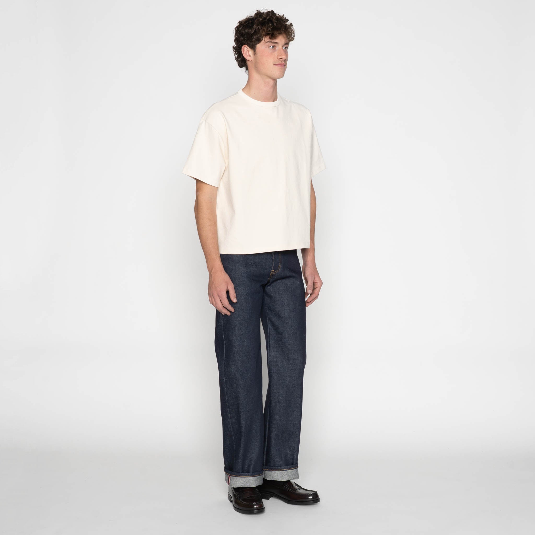 The Strong Guy is a relaxed straight fit; high rise, fuller in the seat and thigh that falls to a wide leg opening.